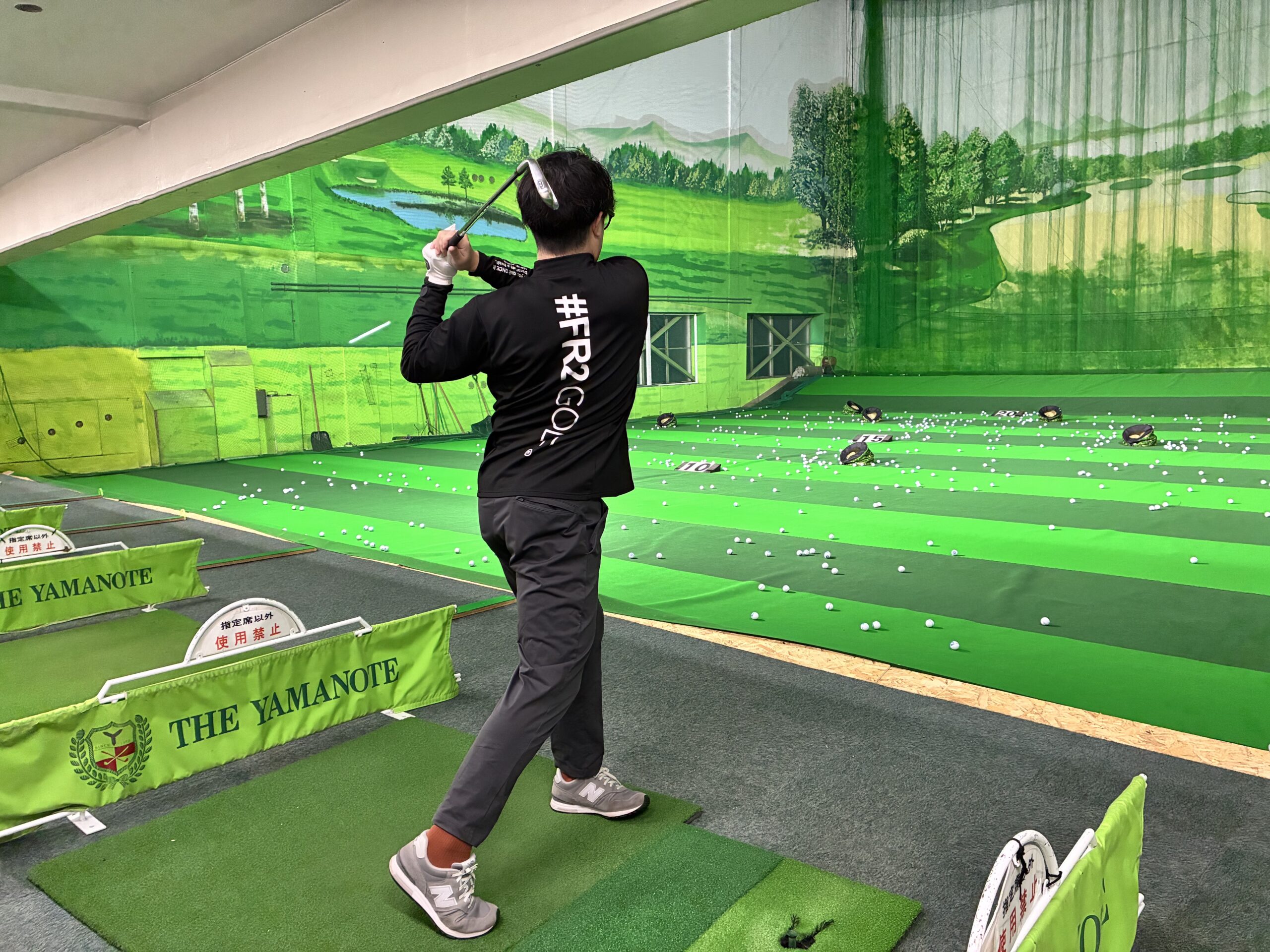 最初は自由にスイングしましたが、10球程度打ったあとは自身の癖である肩の開きを意識して9番アイアン→7番アイアン→4番ユーティリティ→ドライバーの順でレッスンをおこないました。