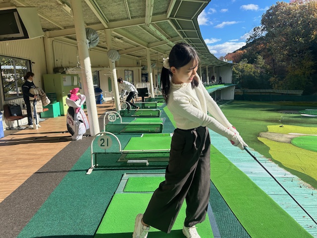 アイアン、ドライバーの練習をした後、アプローチを教わりました!3種類のスイングの振り幅を確認し、安定して芯に当てられるように練習しました。アプローチの練習では特にトップしてしまうことが多く、あらぬ方向、距離に飛んでいくのでとても難しかったです💦