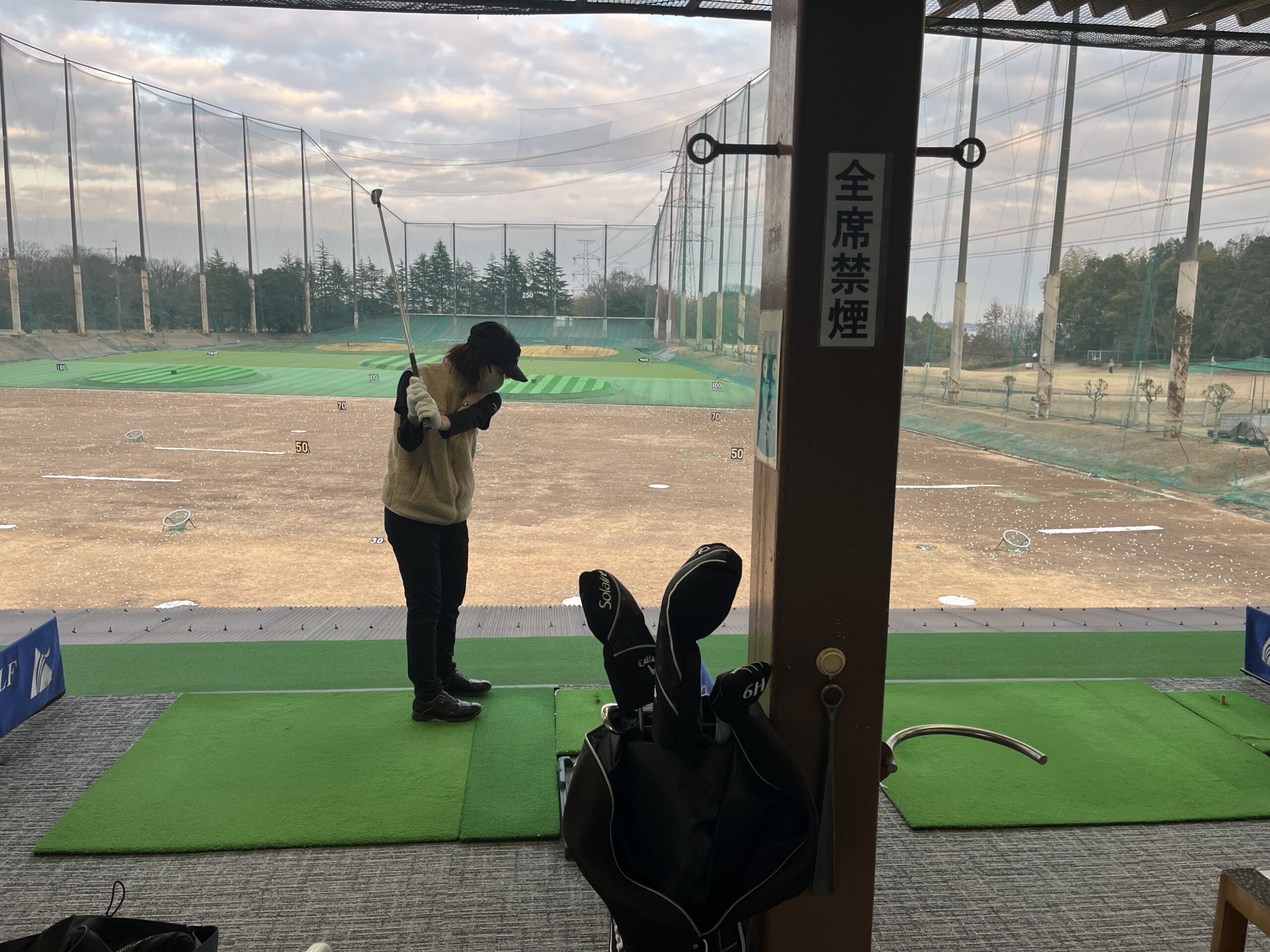 8時‐4時、9時‐3時の振り幅で素振りを繰り返し、右太ももを少し前に意識して構えました。クラブは思ったより短めに持ち、左肘は左へ開く感覚を意識。コックを立て、足裏を安定させたまま頭を動かさずスイングしました。ドライバー練習では足を開き、右へ振った際にクラブ先端が壁側へ垂直になる動きを確認しました。